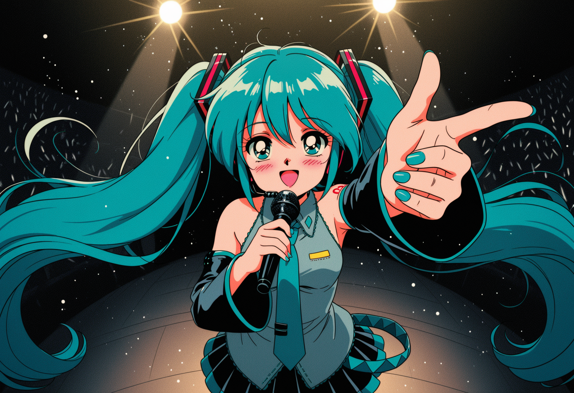 1girl, hatsune miku, hair ornament, twintails, aqua hair, aqua eyes, aqua necktie, grey shirt, collared shirt, detached sleeves, black sleeves, red tattoo, aqua trim, pleated skirt, black shirt, thigh boots, black boots