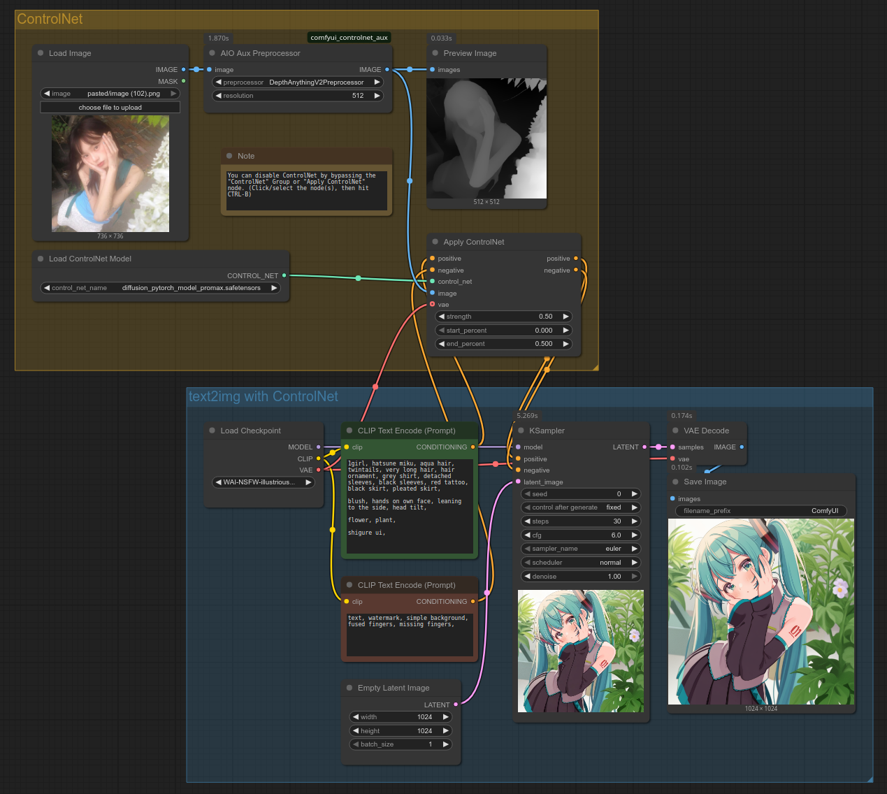 Нода принимает значения conditioning positive и negative, и отдаёт новые значения conditioning positive и negative с применённым ControlNet. ControlNet можно отключить, выбрав ноду "Apply ControlNet" и нажав CTRL-B: если нода отключена, она отдаст значения positive и negative без изменений.