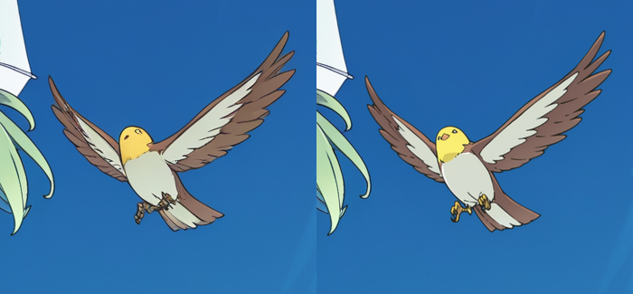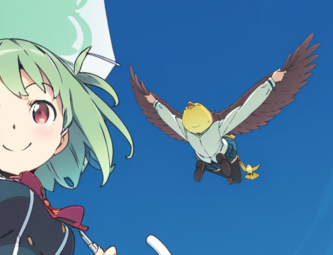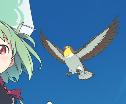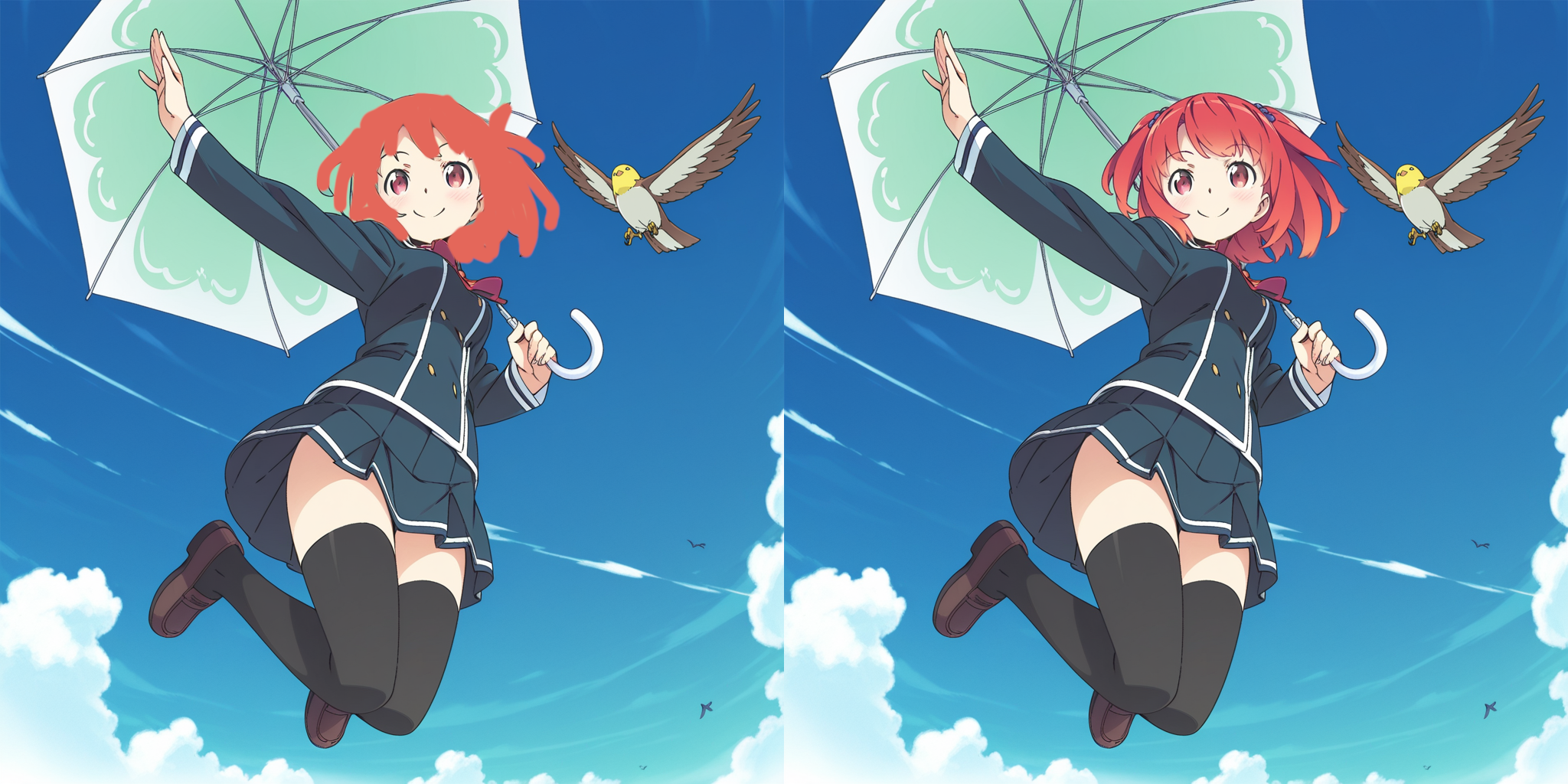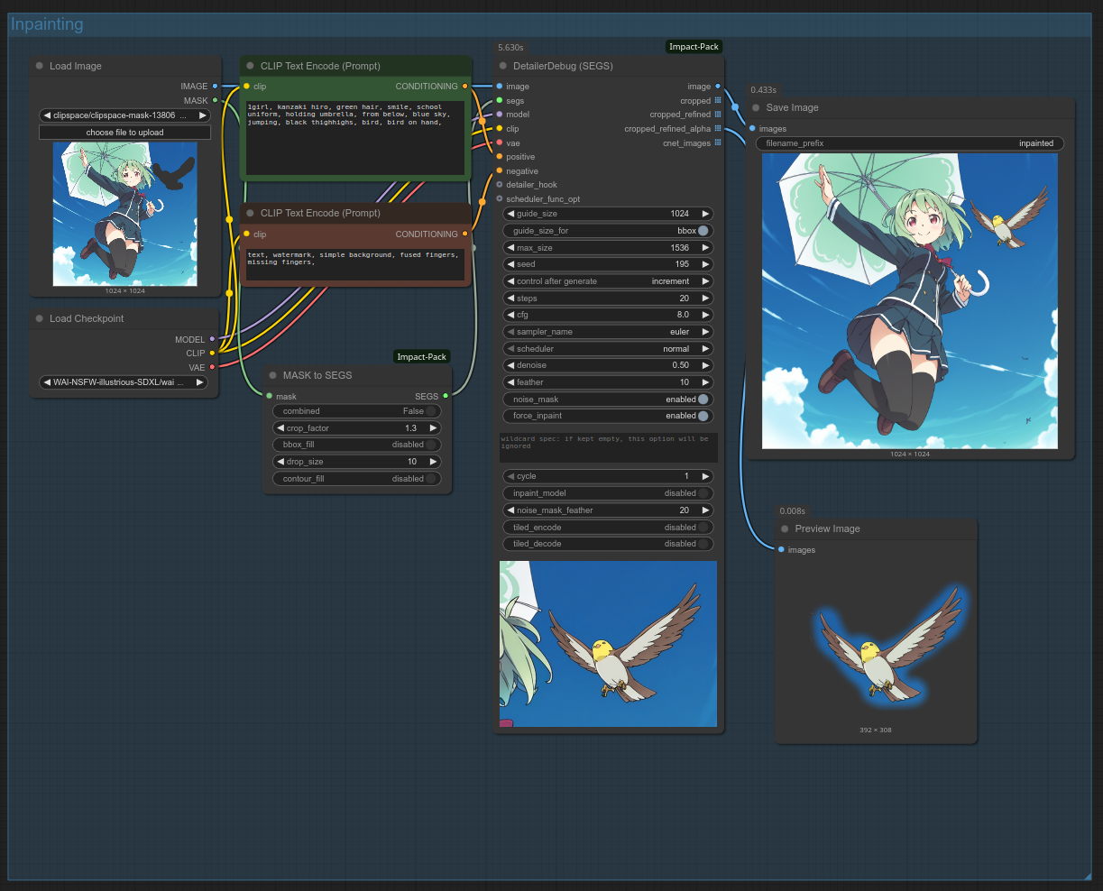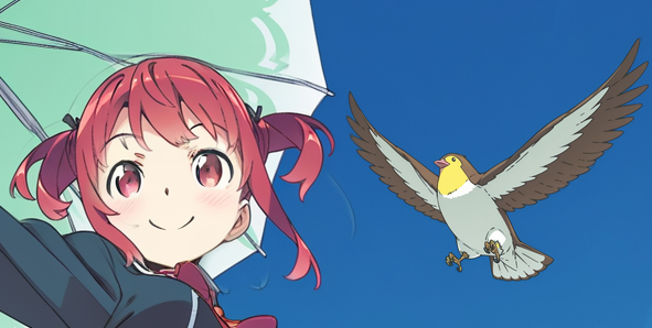Упс. С более высоким denoise KSampler добавил птице школьную форму. Чтобы исправить это, нужно изменить промпт так, чтобы он описывал только обрабатываемую область. Изменение промпта на kanzaki hiro, bird, blue sky даёт такой результат: