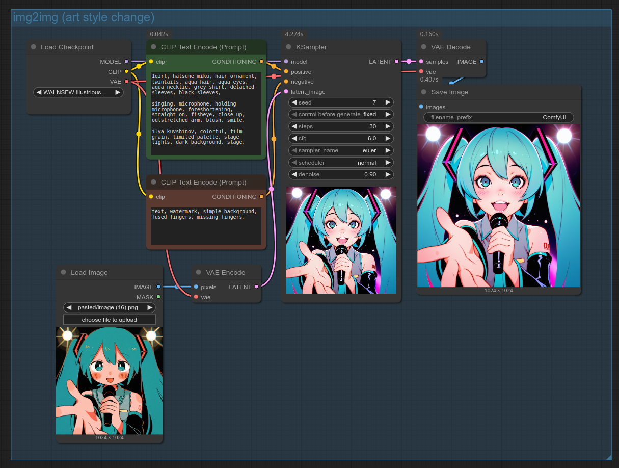 - latent_image: Входное изображение. Для text2img — пустое латентное изображение. Для img2img — существующее изображение (преобразованное в латент).