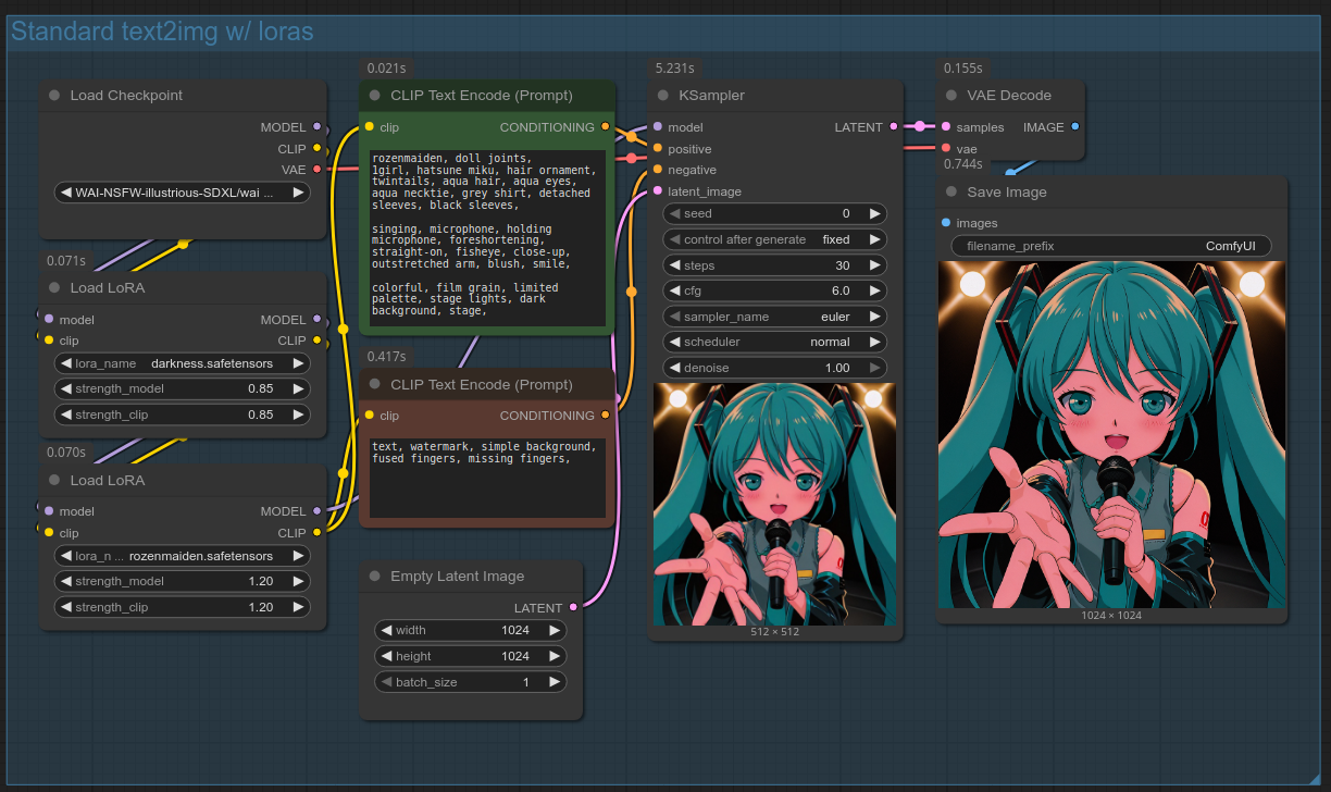 Это руководство ранее рекомендовало использовать "LoraLoaderModelOnly" вместо "Load LoRA". "LoraLoaderModelOnly" проще, потому что применяет лору только к значению "MODEL". Неприменение лоры к CLIP по сути делает триггерные слова лоры ненужными; однако это может быть вредным, если лора содержит несколько концептов, а генерировать нужно не все из них (например, мультиперсонажная лора), или при региональном промптинге, когда лору нужно активировать только в определённых регионах. "LoraLoaderModelOnly" всё ещё можно использовать в большинстве случаев, но "Load LoRA" позволит избежать любых подводных камней в будущем.