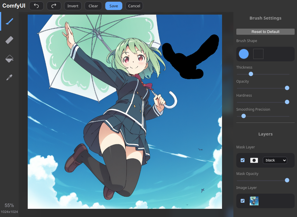 Воркфлоу можно открыть, перетащив скриншот выше в ComfyUI. (Если это не работает, сначала нужно сохранить его на ПК.) Изображения нужно загрузить самостоятельно (1024x1024.png), затем щёлкнуть правой кнопкой мыши на них, выбрать "Open in MaskEditor" и нарисовать маски.