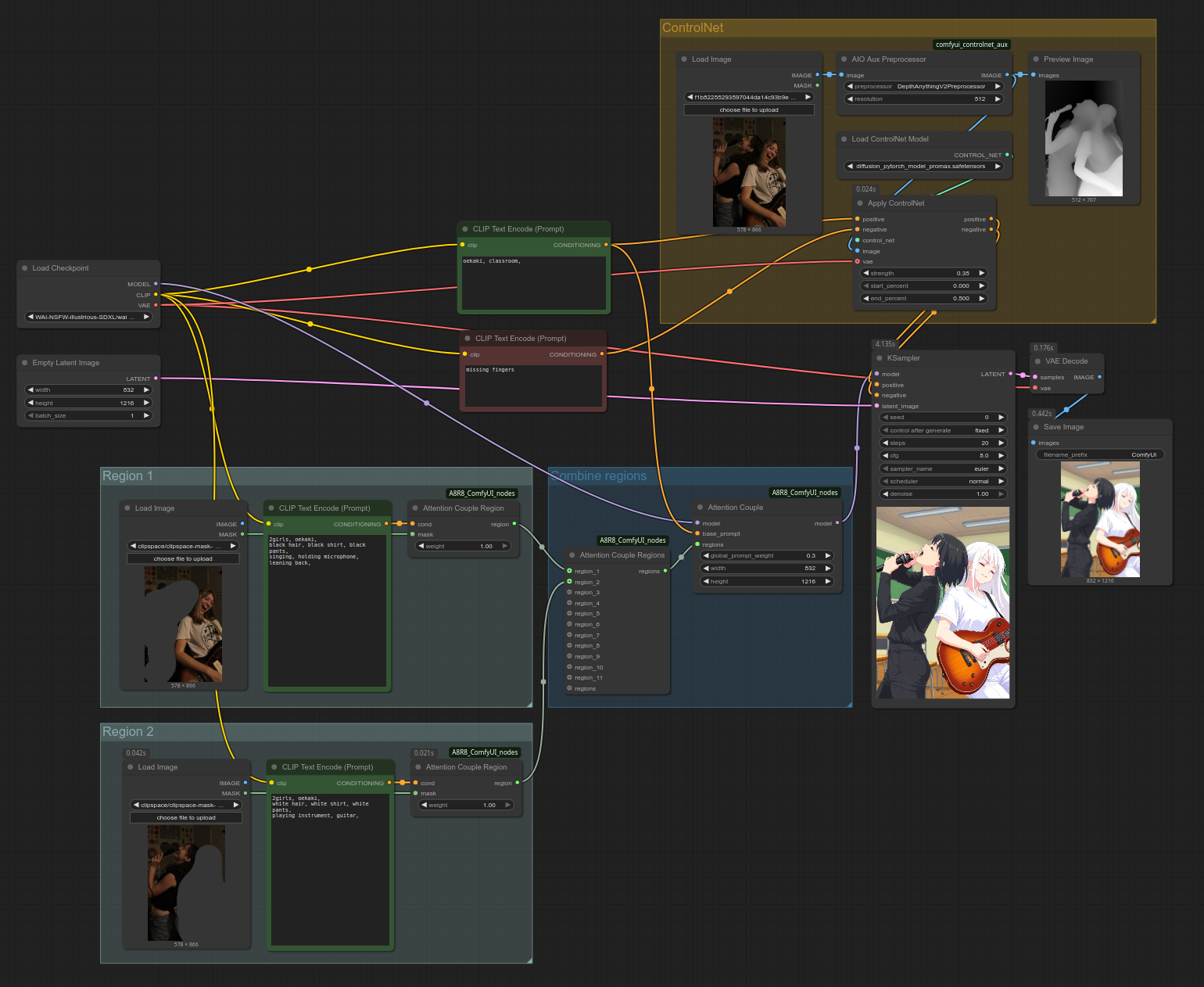 В ComfyUI есть встроенные ноды для регионального промптинга "Conditioning (Set Mask)" и "Conditioning (Combine)", но они плохо сочетаются с ControlNet. При применении ControlNet перед регионами он полностью затирается. При применении после регионов цвета становятся блёклыми. Пошаговый анализ превью при генерации также показывает, что метод ComfyUI фундаментально отличается от A8R8, возможно, в худшую сторону (неподтверждено).